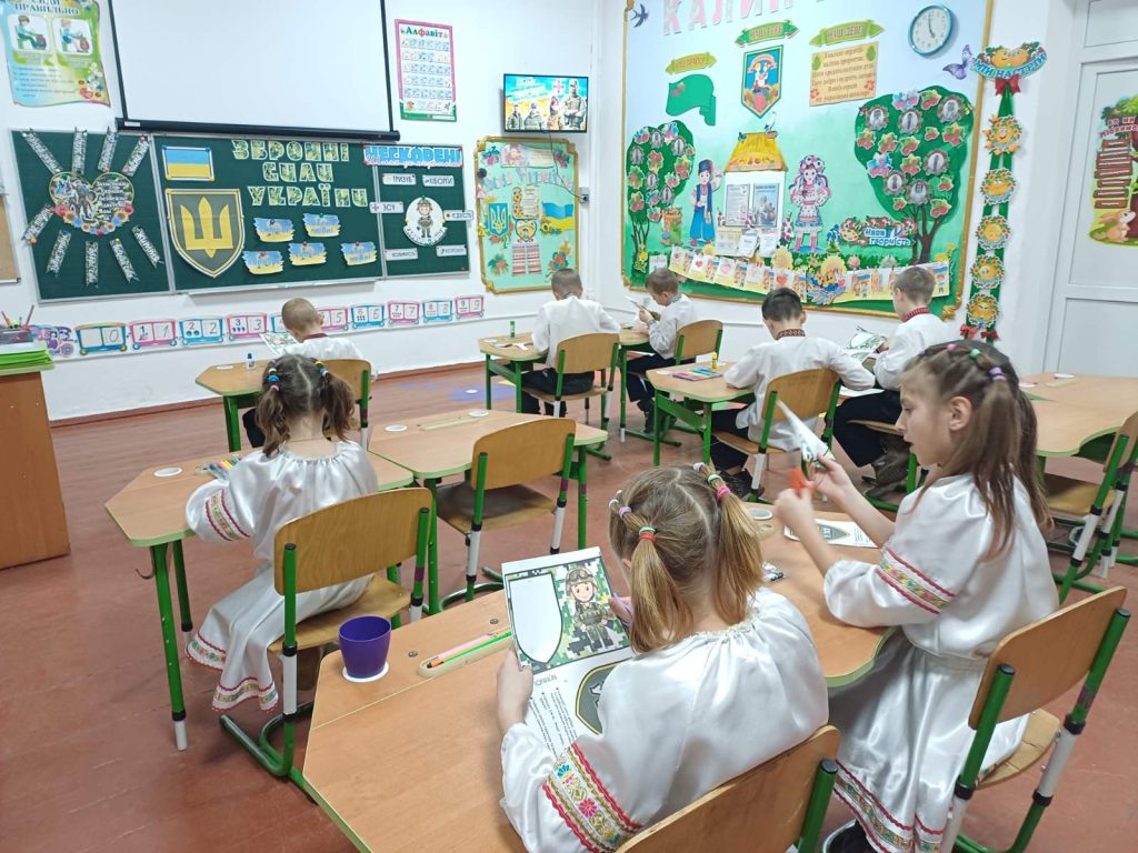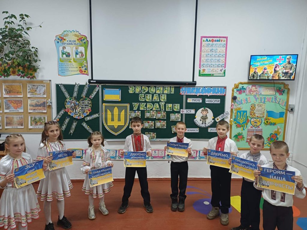Педагоги підготували виховні бесіди про мужність, звитягу та патріотизм, акцентуючи увагу учнів на важливості підтримки армії та усвідомленні свого громадянського обов’язку. Вихованці школи взяли участь у творчих майстернях, де виготовляли листівки-подяки для наших захисників, малювали патріотичні символи та писали побажання миру й перемоги.